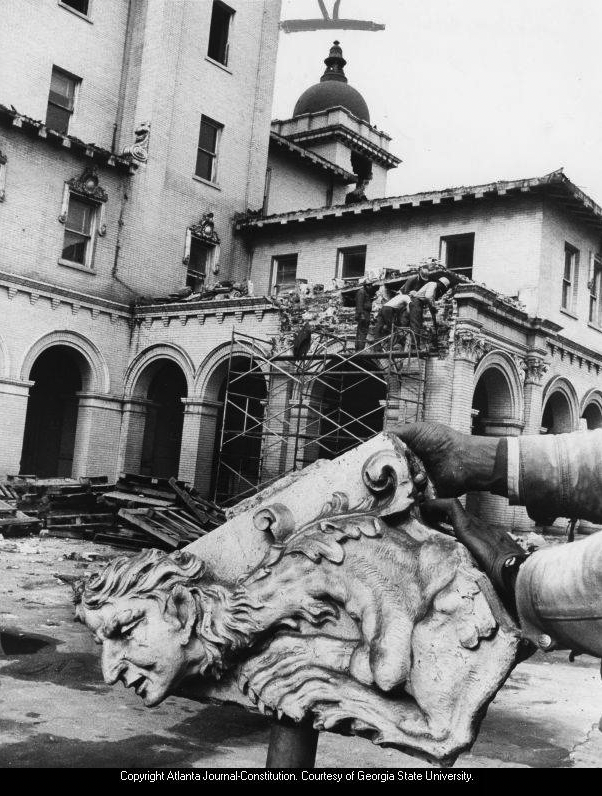 "End of the line. This 66-year-old gargoyle seems a bit broken up over demolition of Terminal Station, praised as a 'magnificent structure' upon its opening in 1905 and now crumbling under the onslaught of progress. The station is owned by the Southern Railway System. A spokesman for Southern in Washington said Tuesday the building is coming down 'because it's no longer used.' The Atlanta chapter of the National Railroad Historical Society Inc. retrieved numerous items of historical interest from the building after it was shut down in 1970, and now the demolition is entering its terminal stages. There are no immediate plans for use of the property, the Southern spokesman said. (Staff photo -- Guy Hayes)." Caption date-stamped: Jan 26 1972 Constitution.